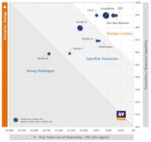 AV-Comparatives stellt den Enterprise EPR CyberRisk Quadrant(TM) vor, der die Effektivität jedes Produkts bei der Vermeidung von Data-Breaches, die daraus berechneten Einsparungen, die Anschaffungskosten des Produkts und die Genauigkeitskosten des Produkts (Fehlalarme) berücksichtigt. Dies ermöglicht es potenziellen Käufern, die Total Cost of Ownership (TCO) zu Überblicken. Die Produkte wurden in drei Kategorien in dieser Hinsicht klassifiziert: