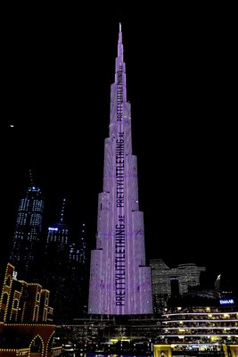 Vor der Kulisse der kosmopolitischen Stadt Dubai wird der symbolträchtige Wolkenkratzer mit lebendigen Lichtern beleuchtet. Diesmal zu Ehren des Starts und der Präsenz der arabischen Website von PrettyLittleThing in der globalen Modeszene.
