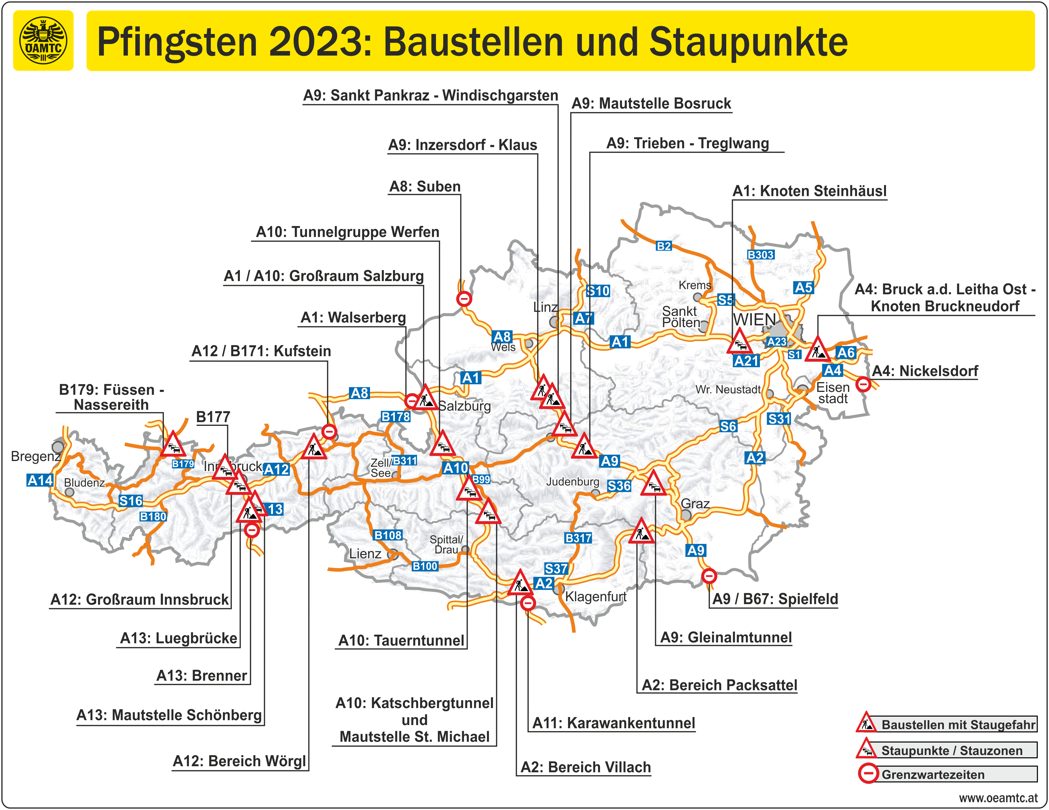 Wien (OTS) – „Die Reiselust ist, wie ÖAMTC- und ADAC-Studien zeigen, in diesem Jahr besonders hoch. Das Auto spielt als Verkehrsmittel bei Urlaubsreisen nach wie vor die Hauptrolle. Daher erwarten wir auch heuer sehr starken Reiseverkehr zu Pfingsten“, prognostizieren die ÖAMTC-Mobilitätsinformationen. „Die ersten Staus werden dabei schon am Donnerstagabend und am Freitag entlang der Transitrouten Richtung Süden auftreten. Da bewegt sich die Reisewelle aus Bayern über Österreich Richtung Adria in die 14-tägigen Pfingstferien. Hauptreisetag wird aber wieder der Samstag.“ Mit Verzögerungen rechnet der ÖAMTC auch auf der Verkehrsachse Grenzübergang Suben (OÖ)–A8–A1– Linz – Knoten Steinhäusl-A21-Knoten Vösendorf-S1-A4-Richtung Nickelsdorf. „Sollten, wie angekündigt, die Grenzkontrollen zu Ungarn verschärft werden, wird es bei Nickelsdorf im Rückreiseverkehr zu längeren Wartezeiten kommen.“