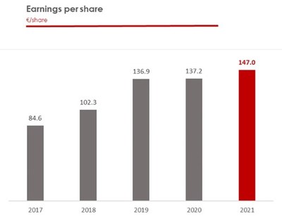 Der Gewinn je Aktie erreichte 147 EUR, ein Anstieg von +7 % gegenüber 2020. Die Gruppe hat in den letzten fünf Jahren eine ausgezeichnete durchschnittliche Wachstumsrate von 15 % erzielt.